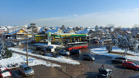 Blick vom Zimmer auf die Hauptstraße und auf die Tankstelle.