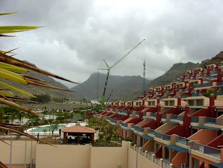 vor Eröffnung: Blick vom NachbarhotelStand: 28. März 2008, der Tag, an dem der letzte Kran abgebaut wurde. Vor der beigen Mauer im Vordergrund befinden sich zwei Tennisplätze, die genau zwischen dem Schwesterhotel Cordial Mogan Playa und der Apartmentanlage liegen, die im März noch nicht eröffnet war. Im Mittelgrund der Pool, der schon gefüllt war.