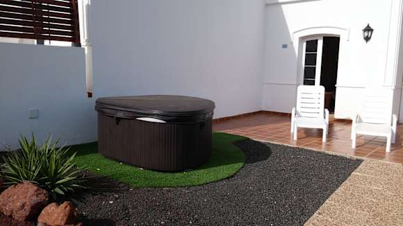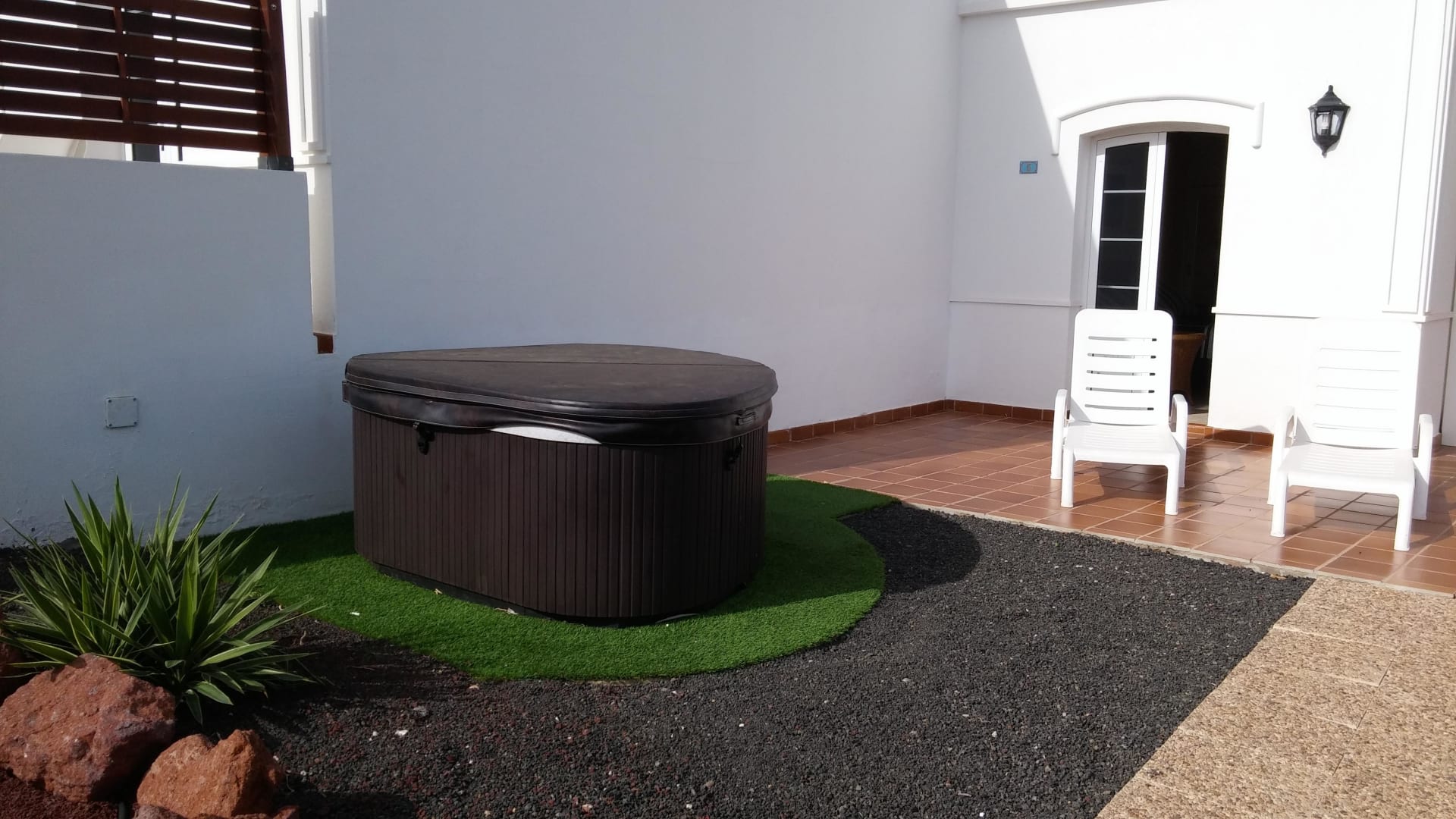 Der abgedeckte Jacuzzi auf der Terrasse