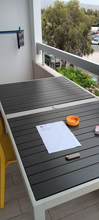 Großer Balkon mit viel zu großem Tisch und 2 Holzstühle. Sehr unbequem