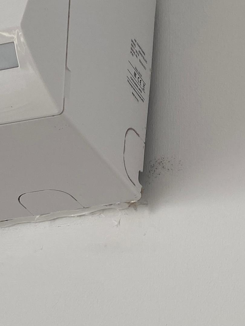 ZimmerNachträglich eingebaute Klimaanlage im Wohnzimmer. Ziemlich dilettantisch und daher vielleicht auch das was aussieht wie Schimmel
