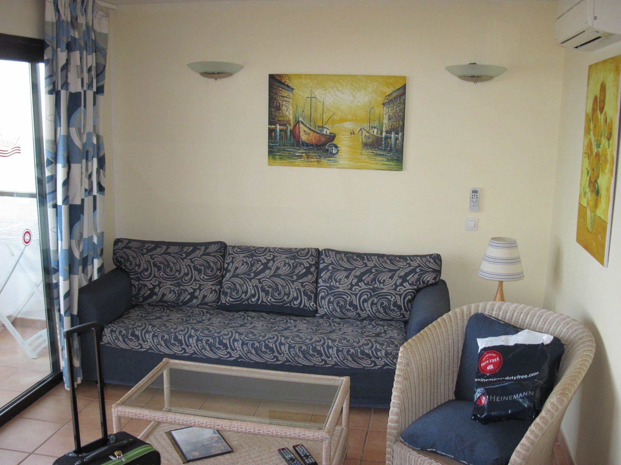 Wohnraum, Couch, Sessel, TischOb die Couch für eine 3. Person wirklich bequem ist? Naja... wir mussten es nicht austesten und zum Sitzen, TV-Schauen, Rumlümmeln ist sie ganz OK. Unter der Glasplatte vom Tisch liegt die Hotel-Info-Mappe sowie die Fernbedienungen für TV + Player