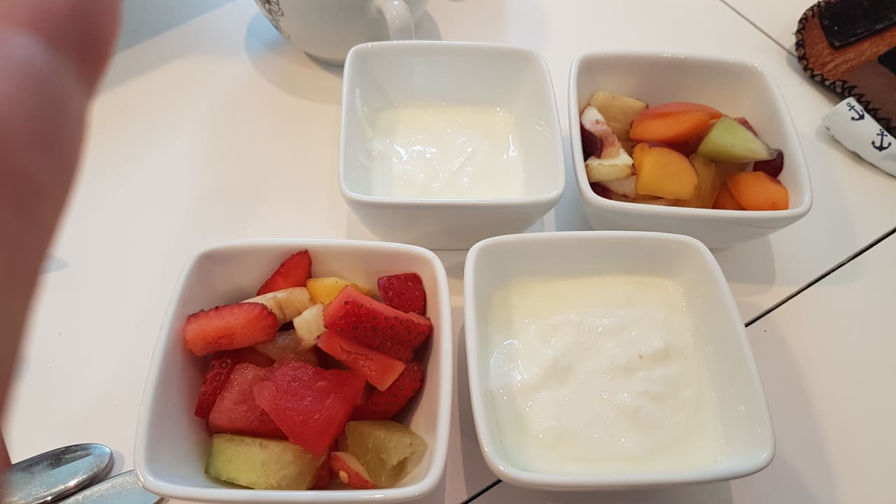GastroDer Hausgemachte Obstsalat bestand aus einer Aprikose und Weintrauben. Joghurt unterschiedlich viel im Schälchen. Selten Erdbeeren.