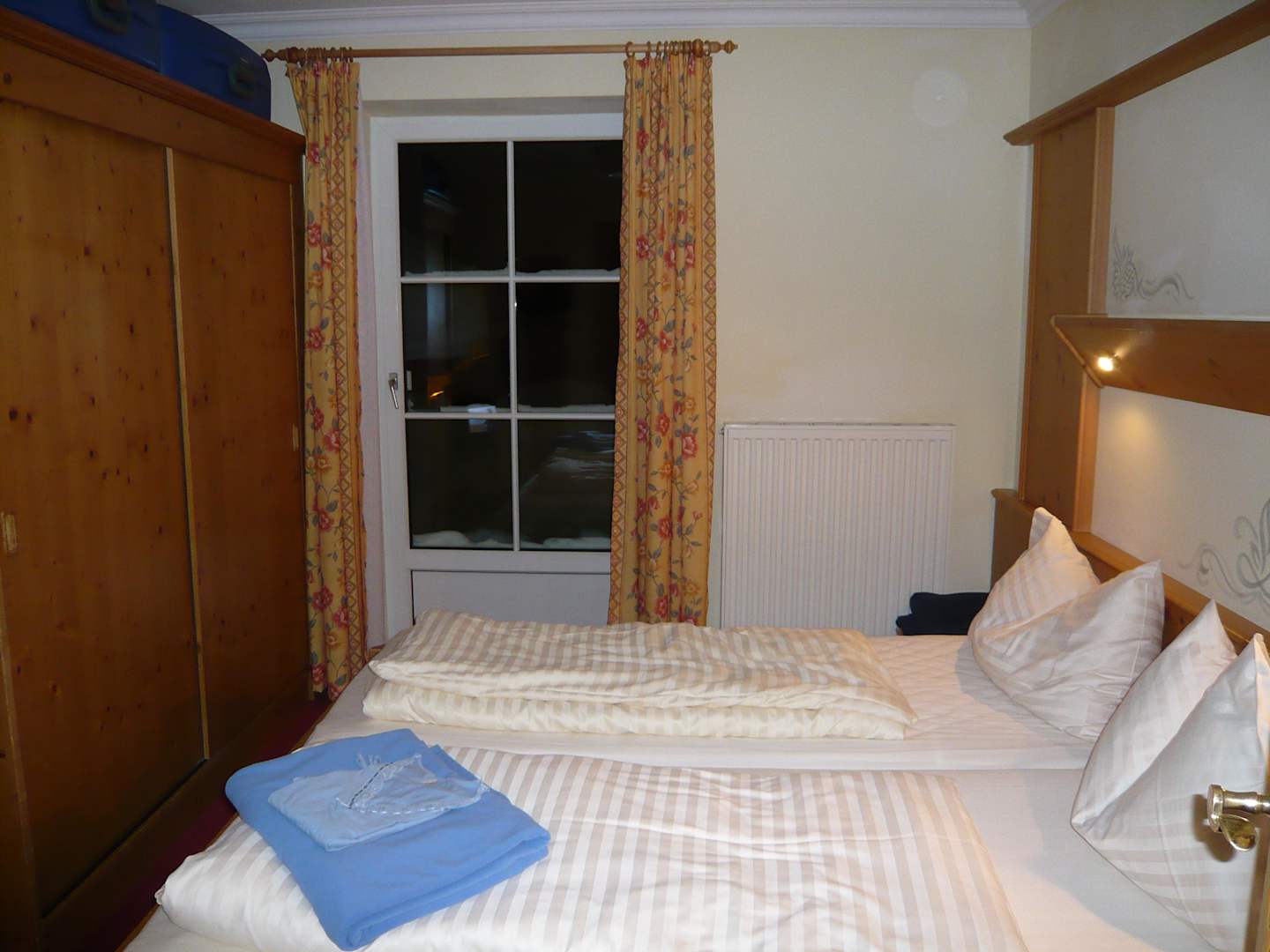 Das bequeme Bett und der Kleiderschrank.