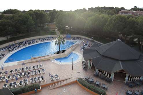 Blick auf den Pool und auf die Bar