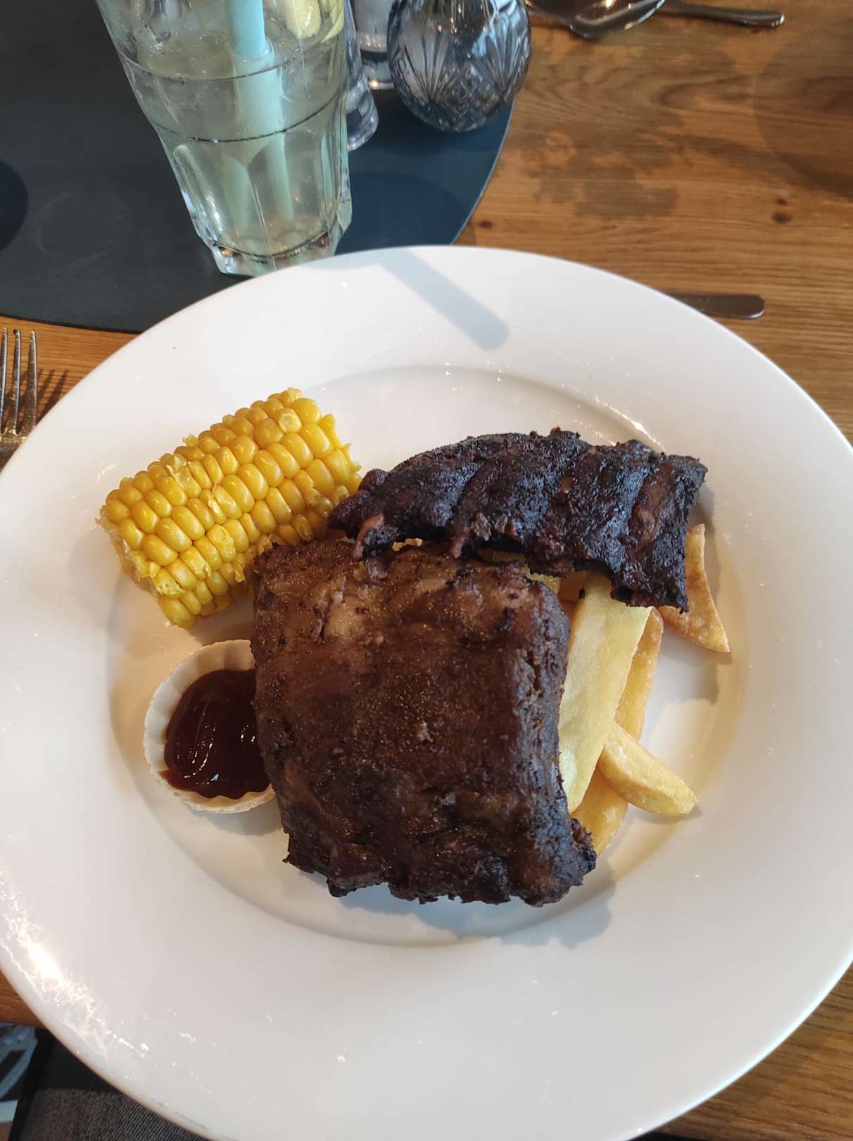 Hauptspeise. Trockene Ribs ohne Würzung mit Sauce in Pappschälchen. Natürlich halber Maiskolben ohne Butter und ein paar "Fries". Muss man erlebt haben.