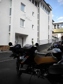 Hinter dem Hotel vor der GarageEs gibt eine Hotelgarage, in der auch Motorräder ohne Aufpreis untergestellt werden können.