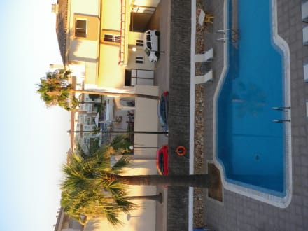 Blick auf ersten Pool des HotelbereichsVorne einer von zwei kleineren Pools der Hotelanlage. Danach kleine Straße, dahinter der Hauptkomplex des Aparthotels. Im Hintergrund ist Kinderspielplatz und großer Pool des Aparthotels andeutungsweise zu sehen (Innenhof der Hauptanlage)