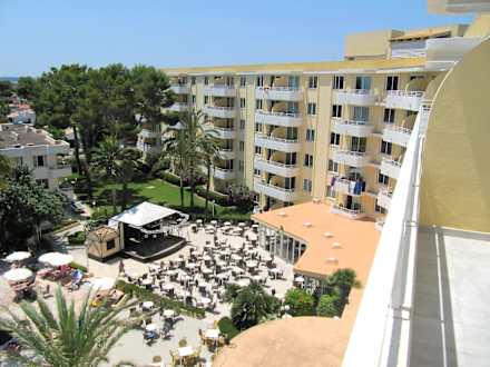 Blick vom Balkon in den Hotelinnenhof mit Bühne