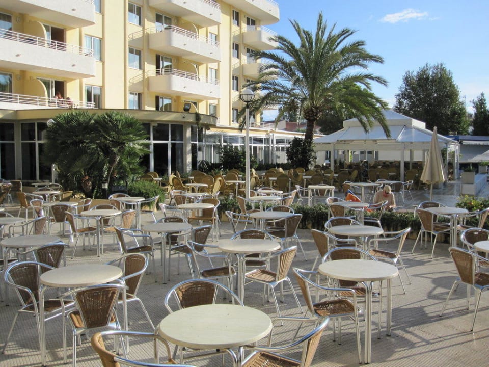Hier der Blick auf die Aussenanlage. Dirkter Blick auf den Speisesaal (Große Fenster hinter den Tischen). Draußen war das Frühstücken und Abendessen nicht gestattet. SEHR NEGATIV!