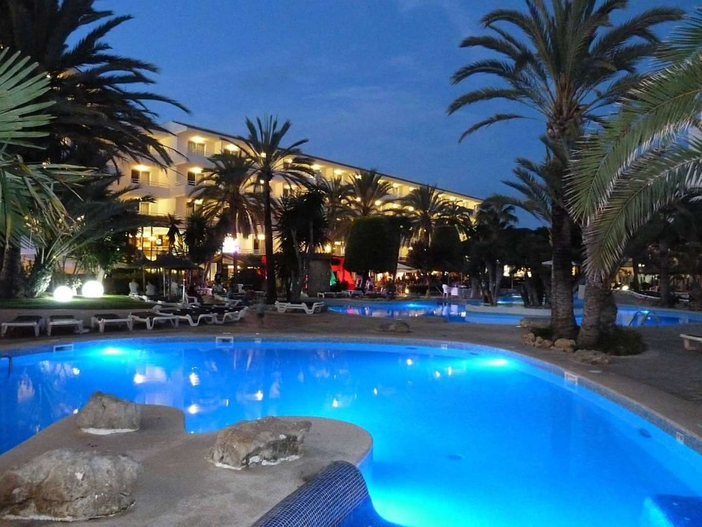 Blick über die Poolanlage bei Nacht