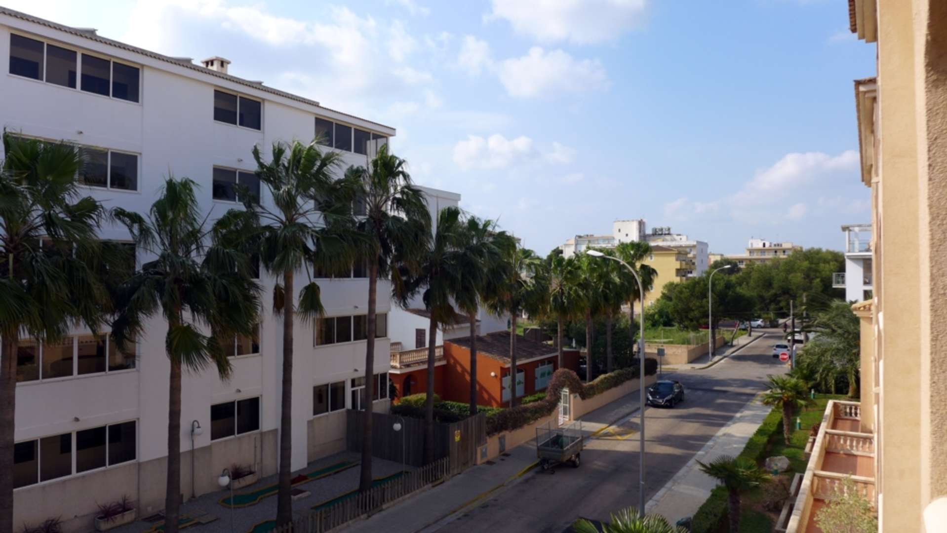 Blick vom Balkon, Gebäude 5, auf die Strasse nach rechts. Das Hauptgebäude liegt links.