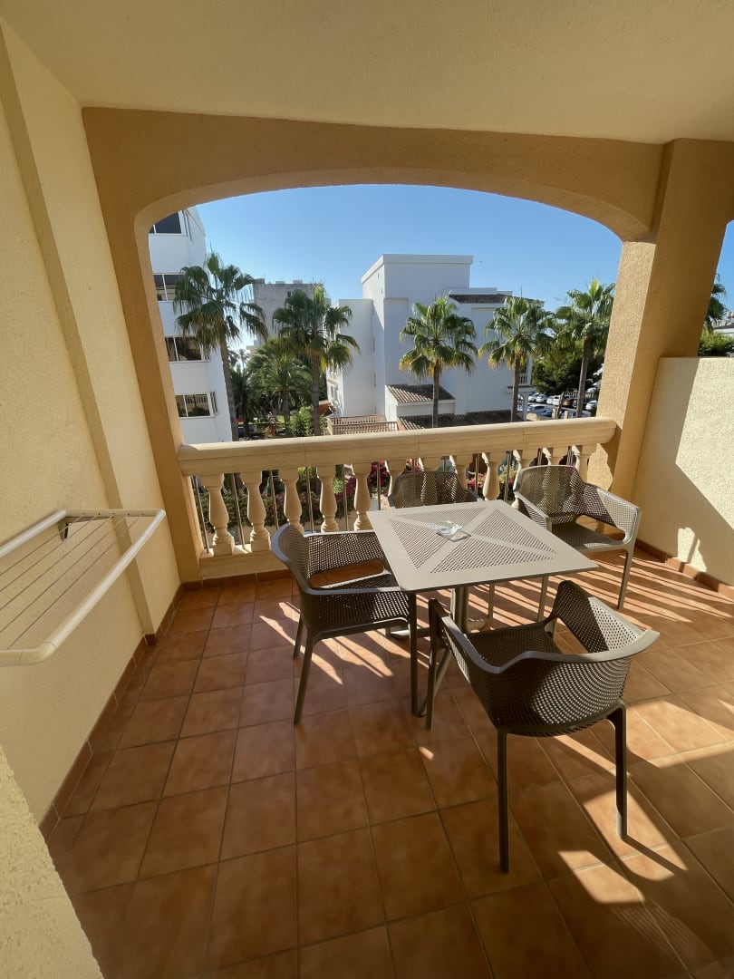 Balkon mit Blick Richtung Garten und Gebäude III (dort ist auch der Supermarkt)
