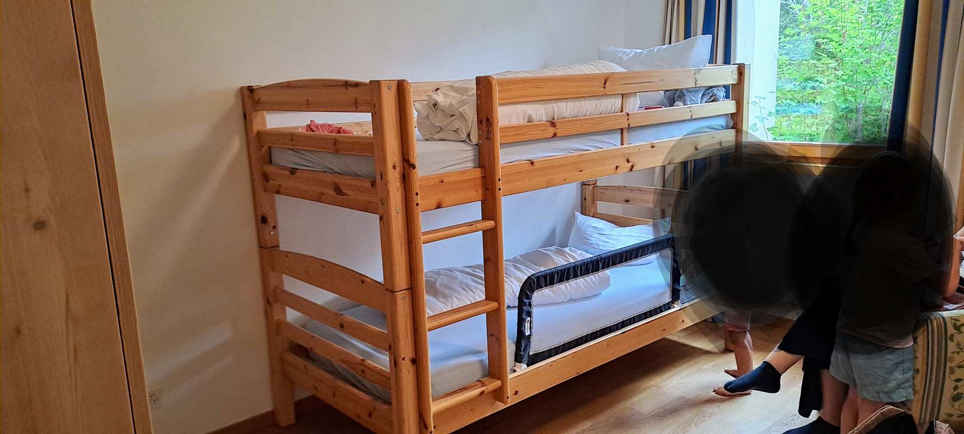 Kinderzimmer mit 2 Betten, 1 grosser Schrank, 1 Tisch und einen bequemen Stuhl