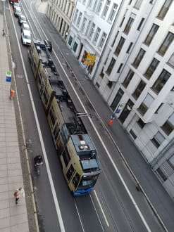 AusblickBlick aus dem Fenster in der 3. Etage, 2 Tram-Linien (4 und 12) halten direkt vor dem Eingang (Haltestelle Lortzingstr. Leipzig).