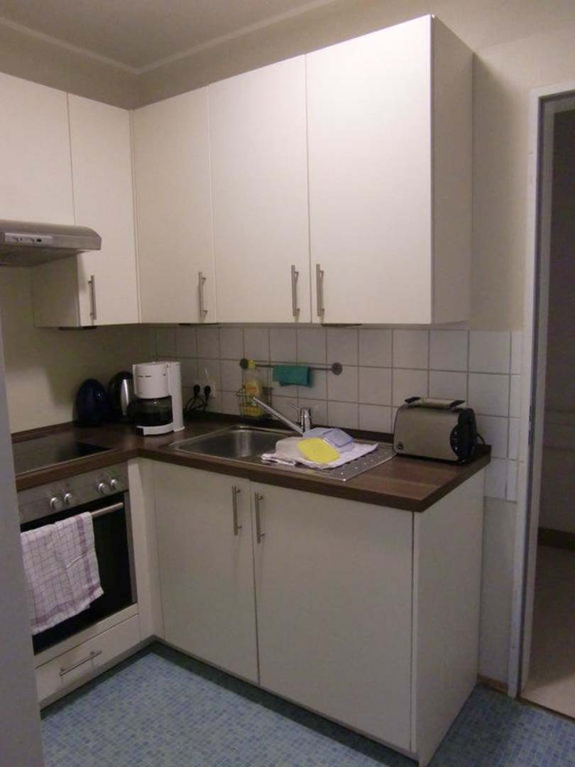 kleine Küche mit Toaster, Kaffekocher, Wasserkocher. Hinter der Küche ist noch ein Reduit mit Waschmaschine und Tumbler. Ideal um Koffern hineinzustellen.