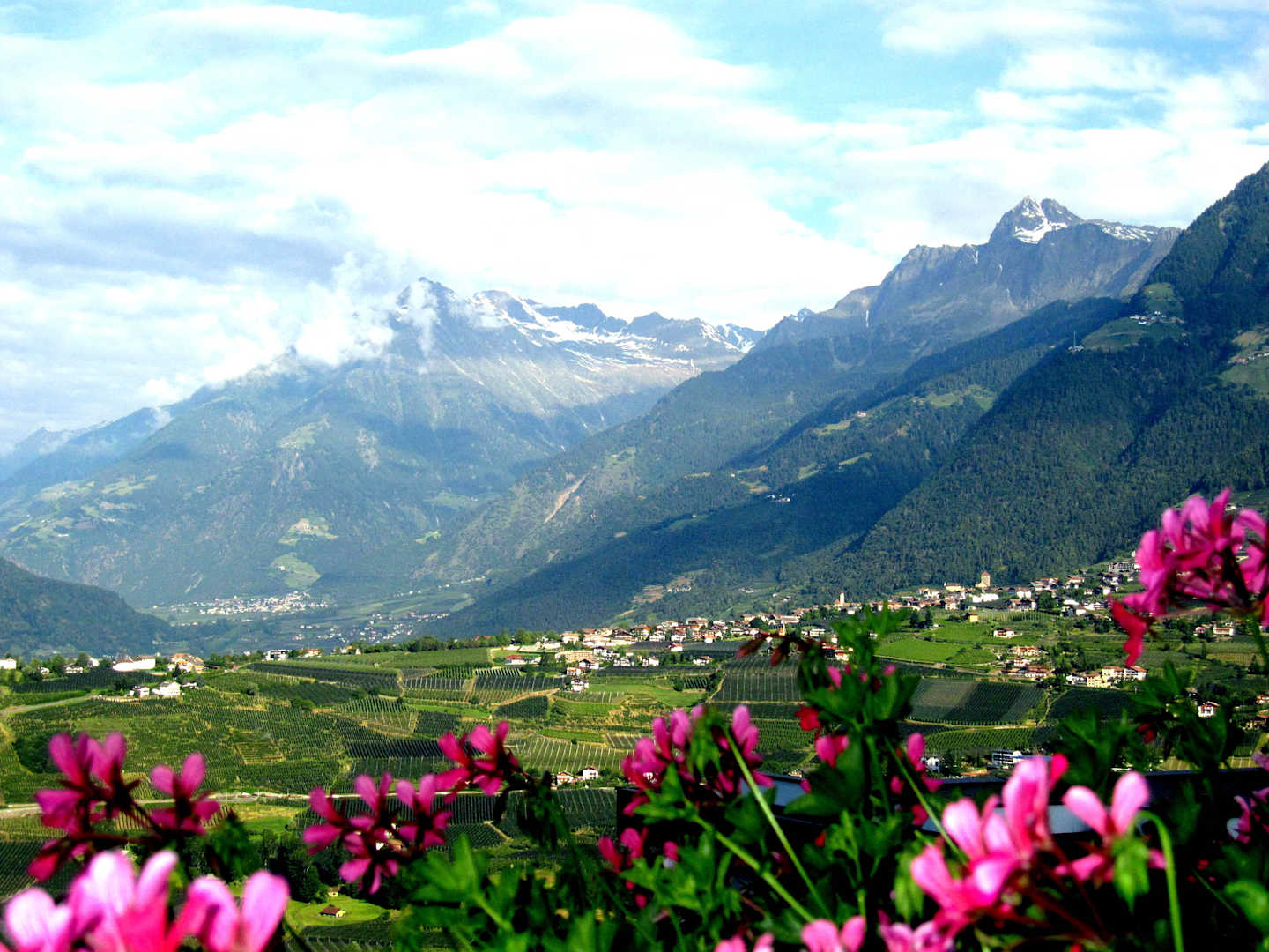 Blick vom Balkon unserer Ferienwohnung in der Residenz Ritterhof in Schenna bei Meran.