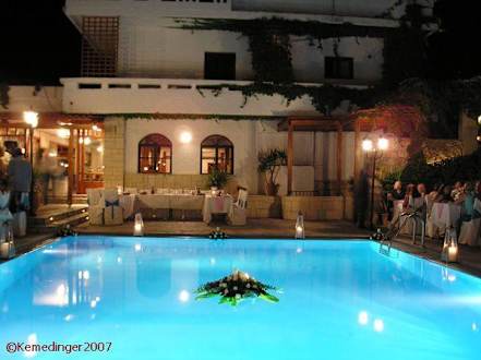 Pool bei einer HochzeitAuf der Terrasse rund um den Pool werden bei einem griechischen Fest Tische und Stühle aufgestellt.