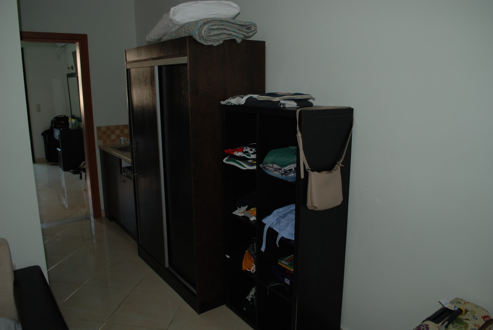 Schrank, Ablagefächer, Spüle mit Kühlschrank und Wasserkocher
