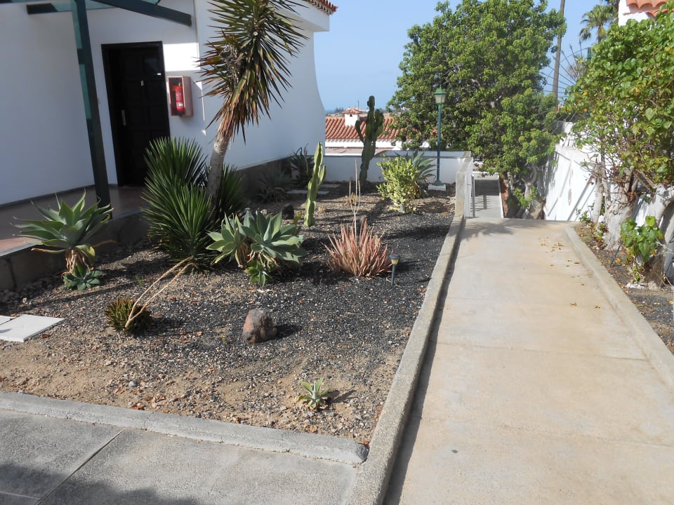 An App. Nr. 1 geht die Treppe nach unten zum Pool und den Appartments Nr. 5-9, sowie der stundenweise besetzten Rezeption Hier gibt es übrigens Wasser in Kanistern für wenig Geld.
