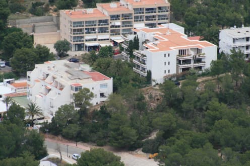 Die zwei Gebäude im Vordergrund sind die Apartments. Dazwischen befindet sich ein Garten durch den man läuft um an das hintere Haus (hier im Bild das Rechte) zu gelangen.
