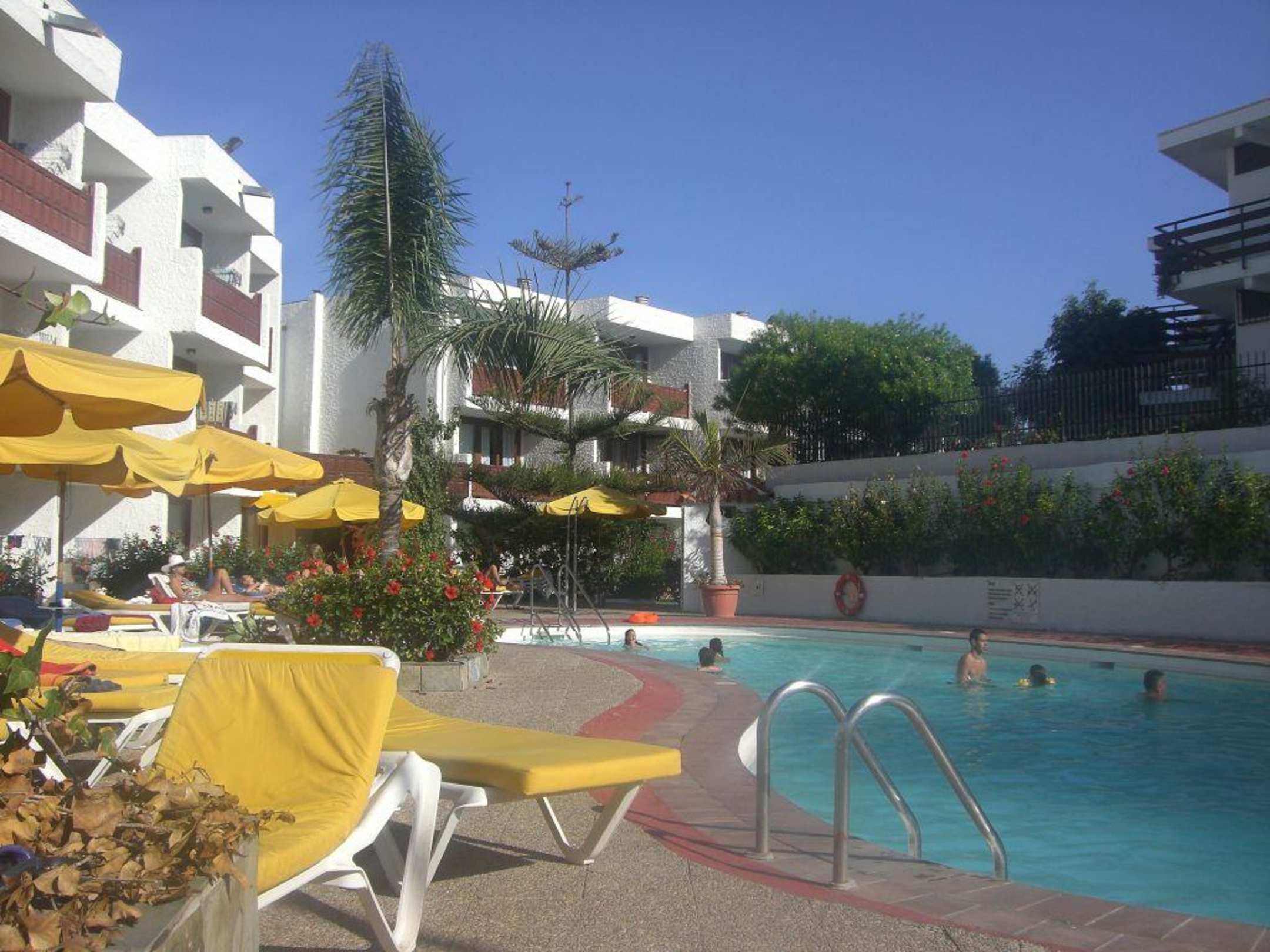Die Balkons zeigen entweder wie hier auf den Pool oder zum dahinter gelegenen Garten. Der Süßwasser-Pool ist mittelgroß. Liegen gibt es zur Genüge, auch zur Hauptsaison!