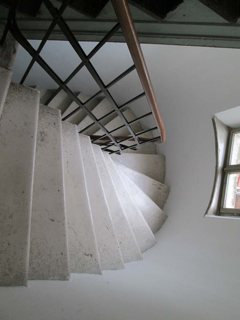 Die "historisch wertvolle" Marmortreppe in den 2. Stock; so geht's in Ermangelung eines Aufzugs weiter bis ins Erdgeschoss. Gepäckstücke sollten daher nicht zu groß und zu schwer sein.