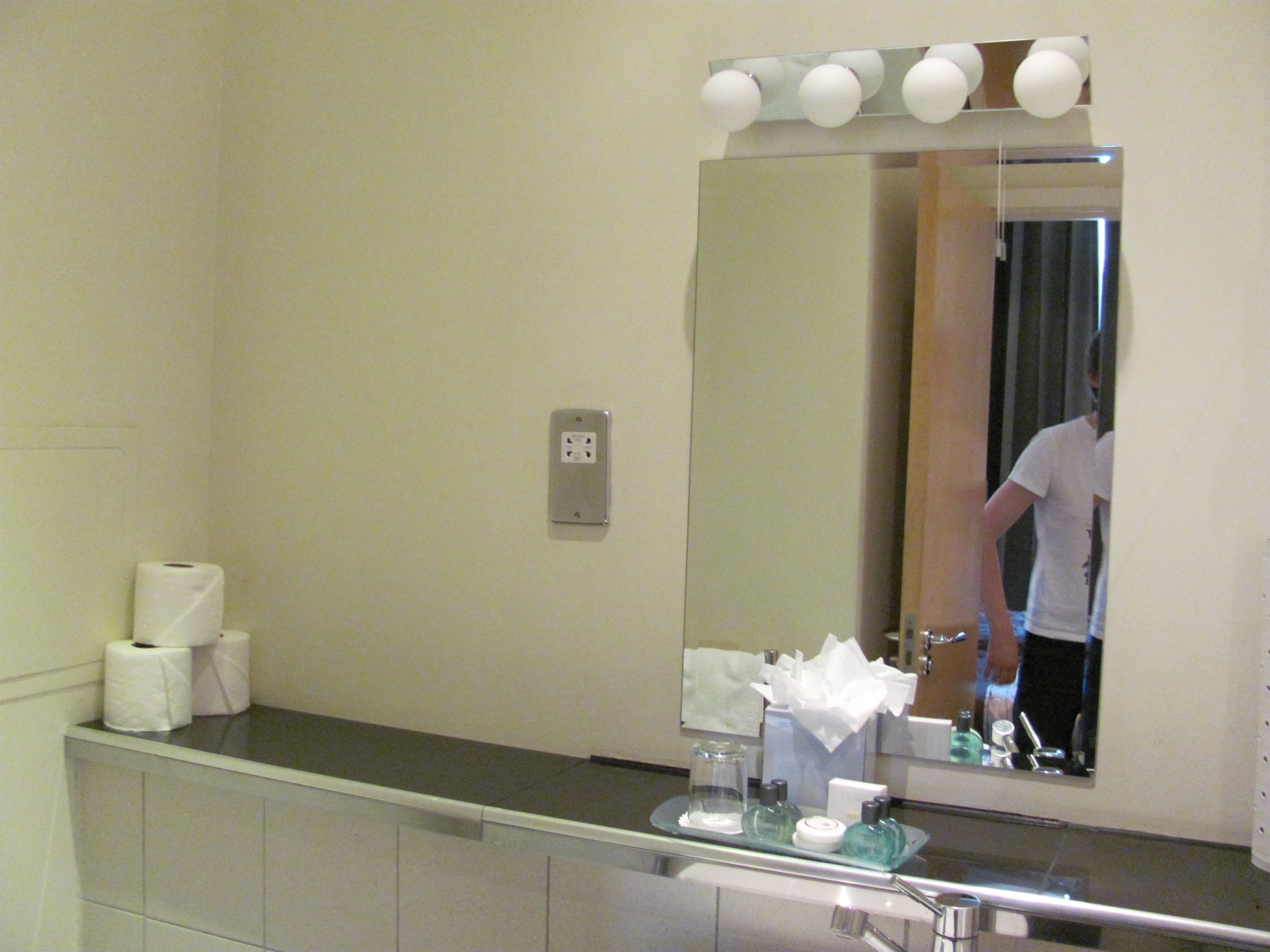 Leider kein Fenster, dafür aber sehr gut beleuchtet mit Deckenleuchten und Spiegelleuchten.