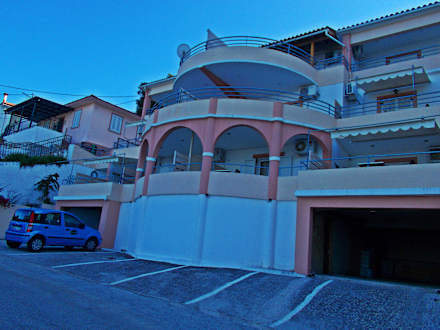 die Sonne bescheint die großen Balkone schon zum zeitigen Frühstück im Mai
