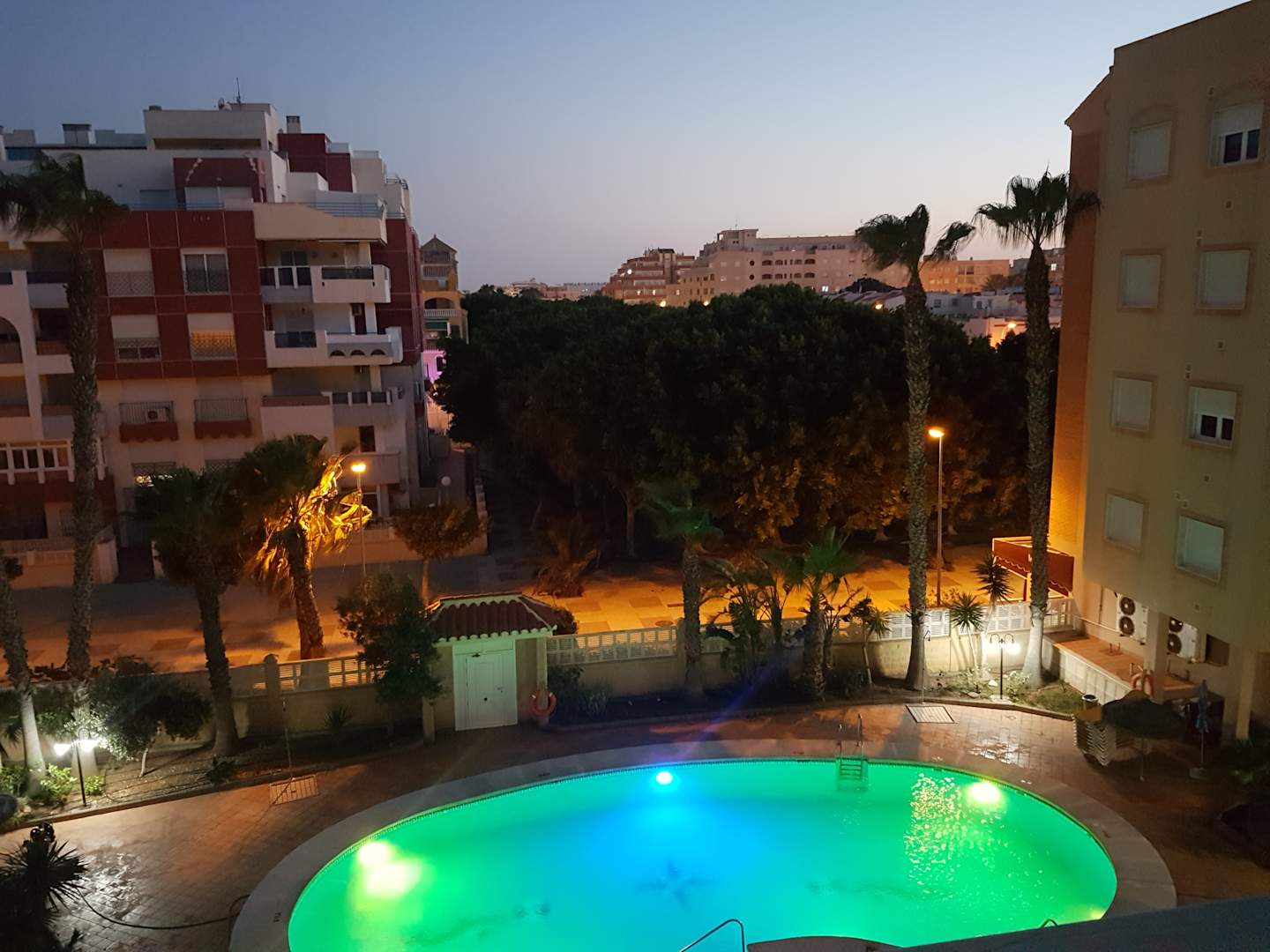 Aussicht vom Balkon bei Abenddämmerung.