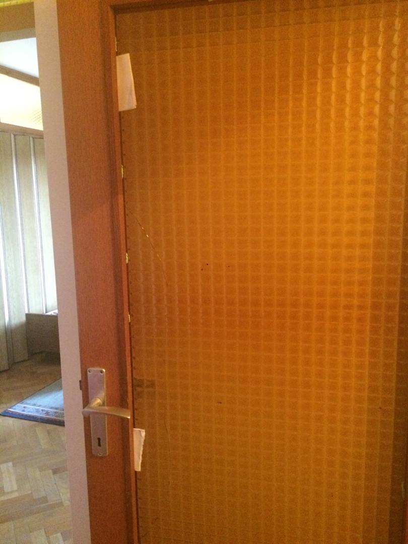 Eine Glastüre mit zersprungenem Glas, fixiert durch Kartonstreifen!!