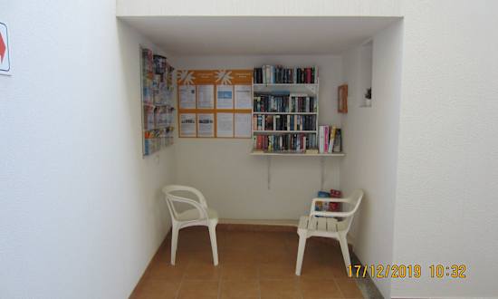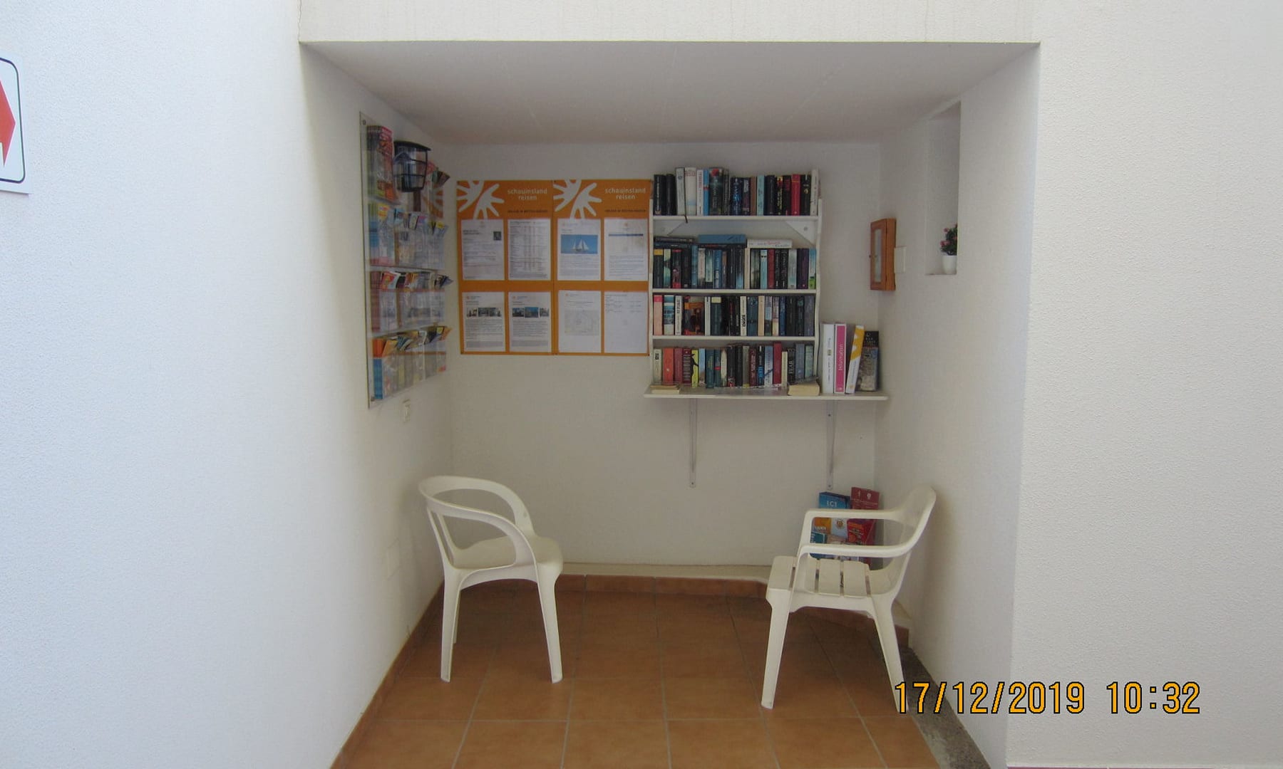AußenansichtIm Außenbereich ist eine kleine Ecke eingerichtet, wo man Nachrichten des Veranstalters lesen kann.