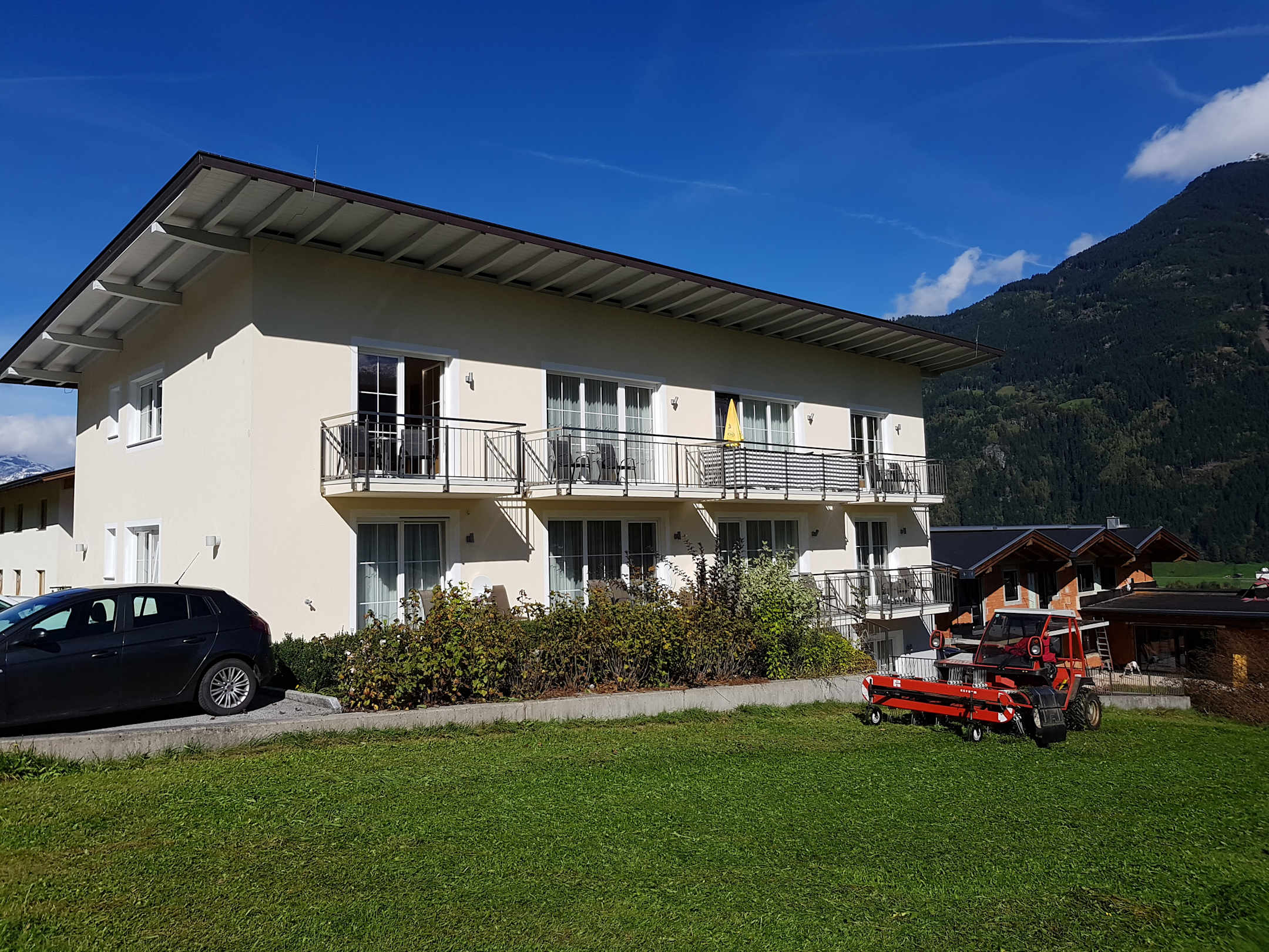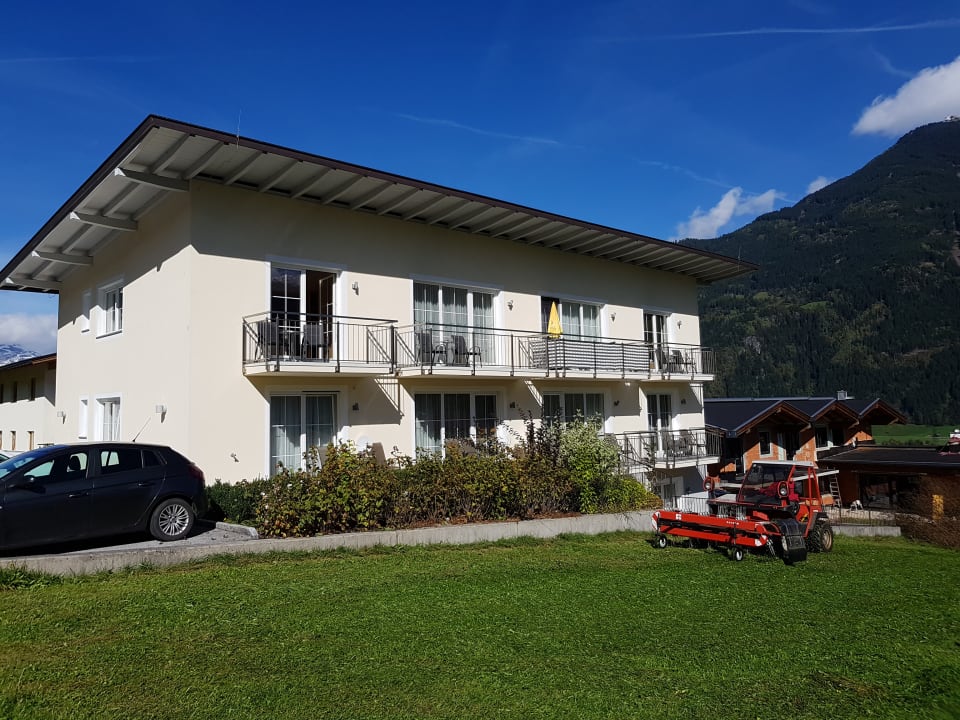 AußenansichtBlick auf das Appartementhaus Platzlhof mit ausreichend Parkplätzen über und neben dem Gebäude. Die Wiesen werden gepflegt.
