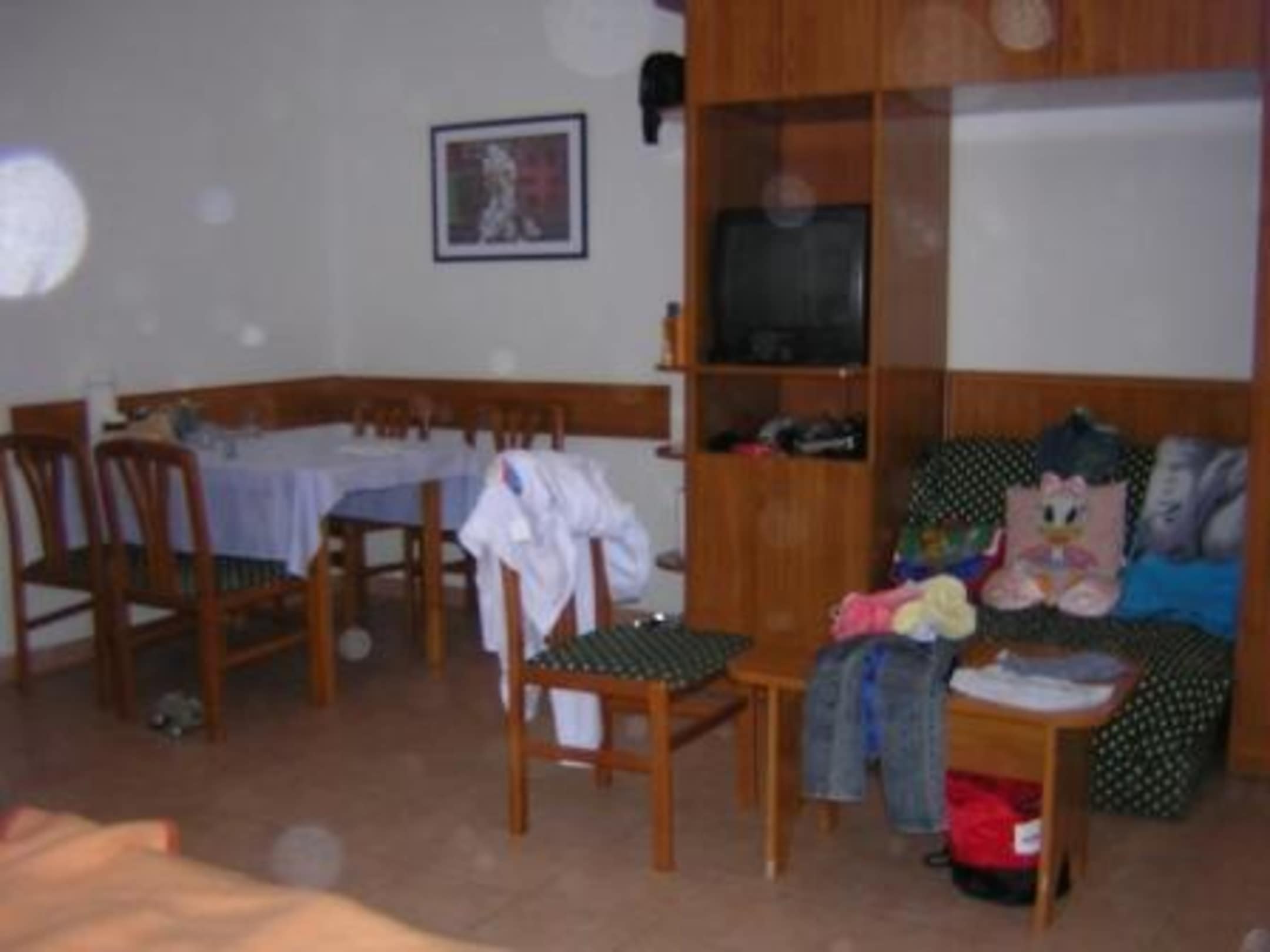 im 5-Personen-Appartement vom Doppelbett aus gesehen - großer Wohnraum mit Essecke