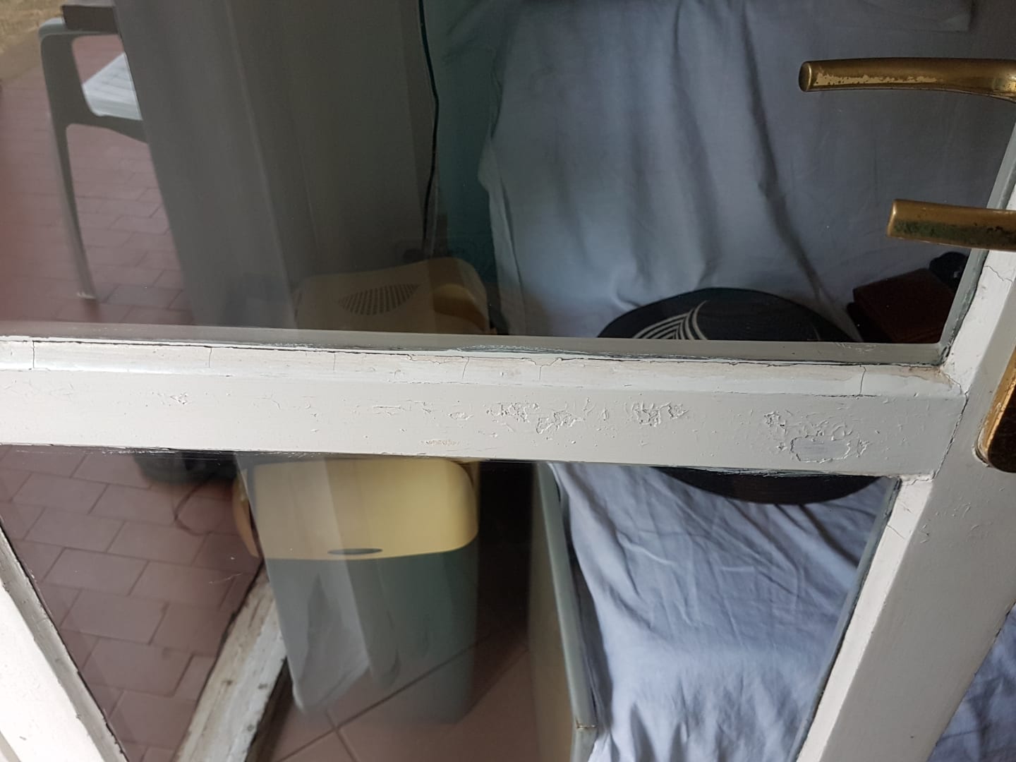 Balkontüre außen. Malerarbeiten grauenvoll. Nur überpinselt.