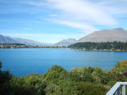 Widok z balkonu na jezioro i góry