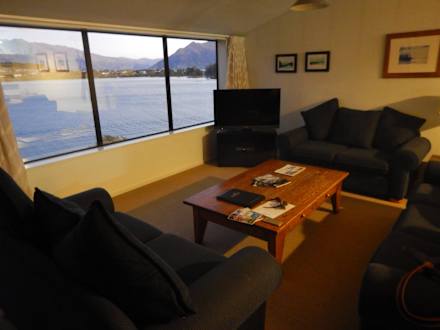 Salon z widokiem na jezioro i góry