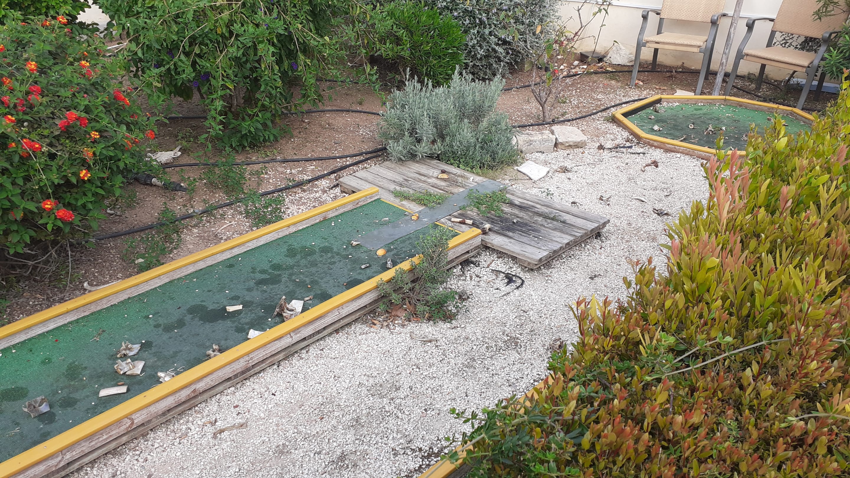Minigolf-Anlage defekt mit Müll (Knochen) übersät