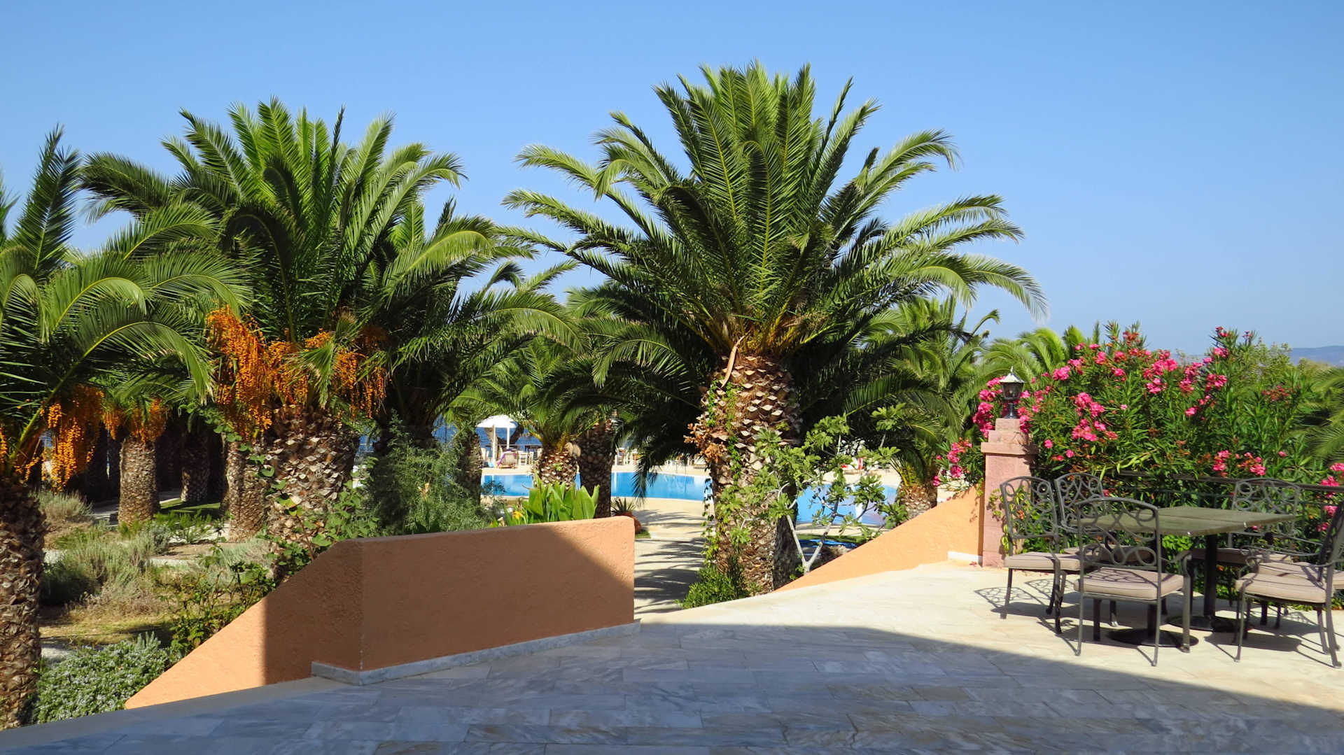 Frühstücksterrasse mit Blick Garten/Pool/Meer