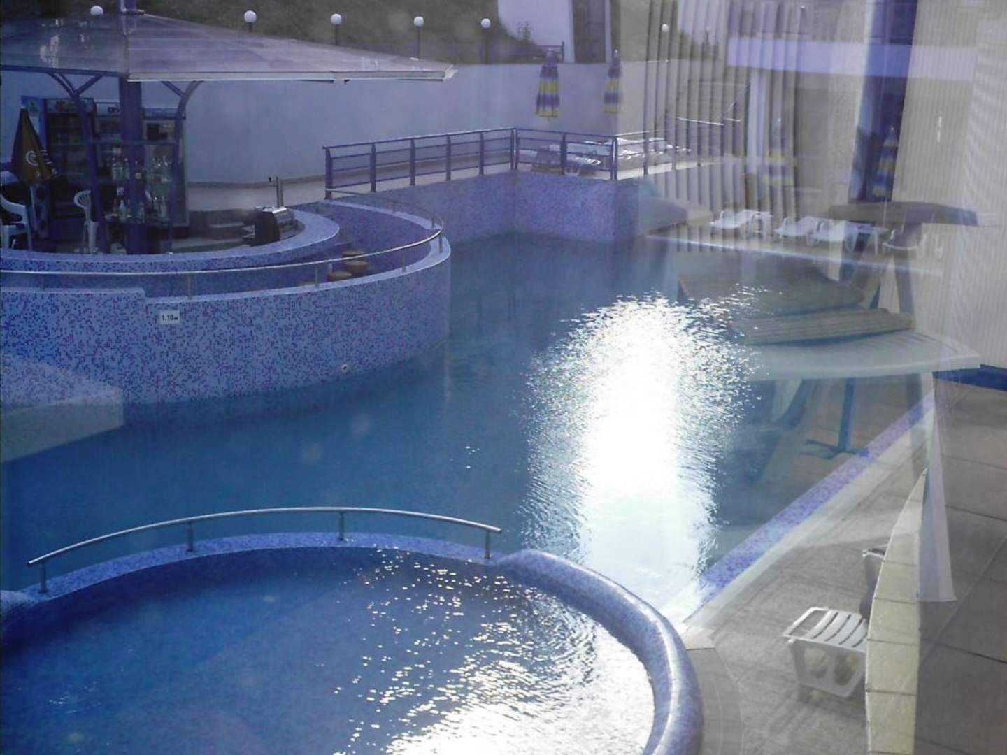 Blick vom Zimmer auf den Pool