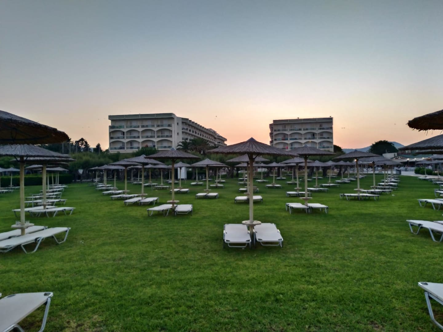 Blick vom Stand aufs Hotel am Abend