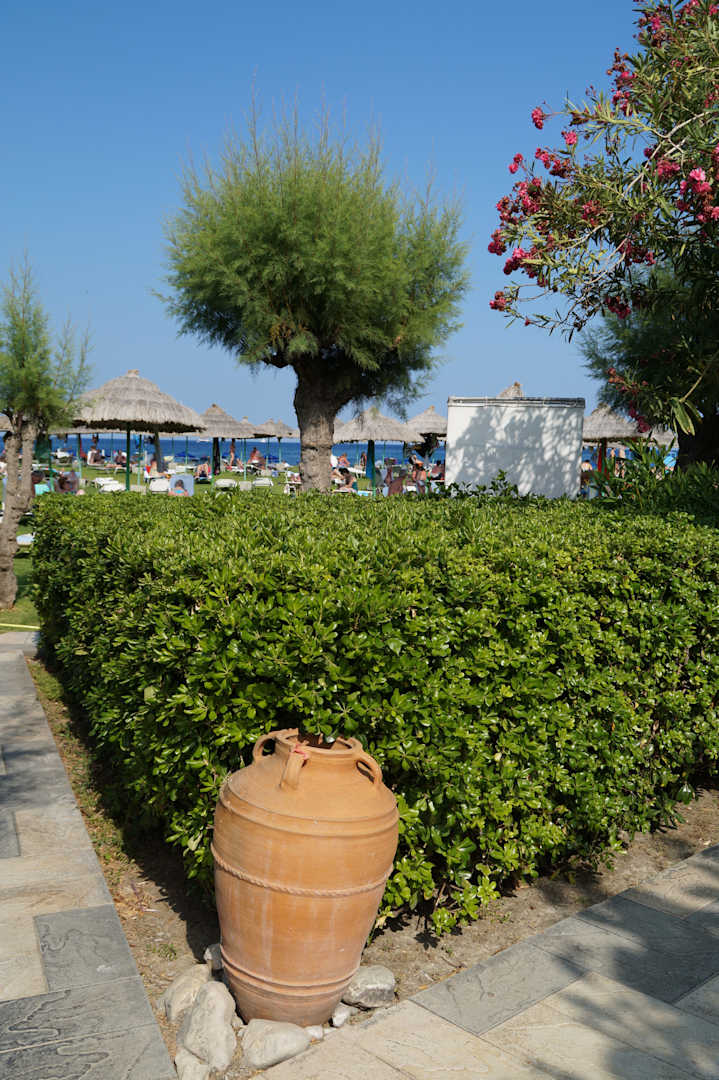 gepflegte Gartenanlage mit vielen Amphoren