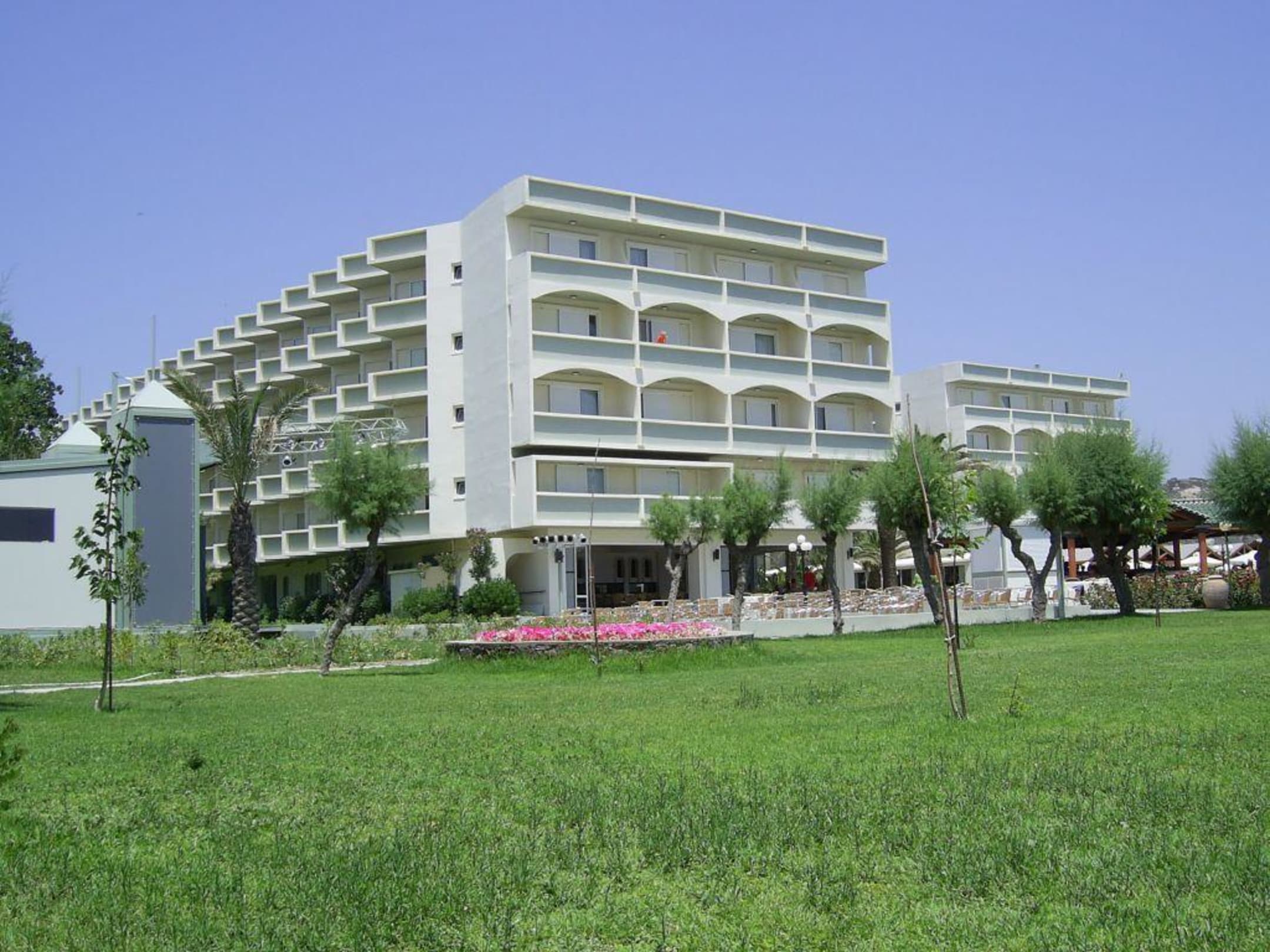 Blick von der Liegewiese auf den linken Hotelblock