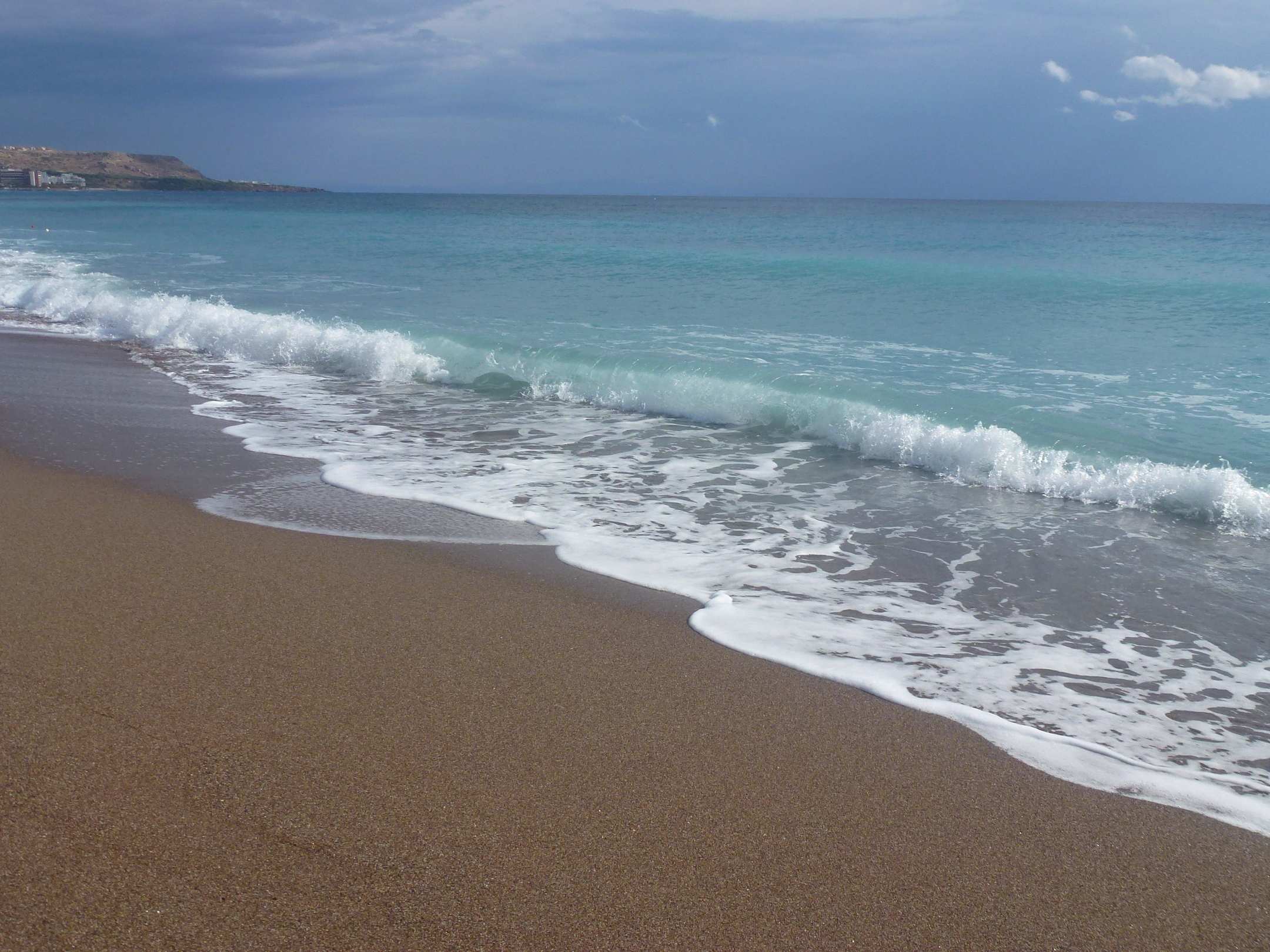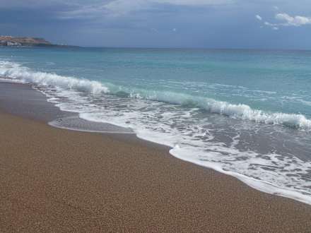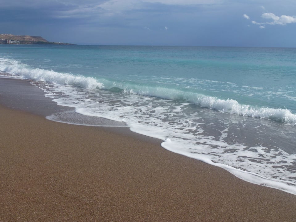 ein wunderschöner langer Sandstrand, der vornean ein bißchen kieselig ist
