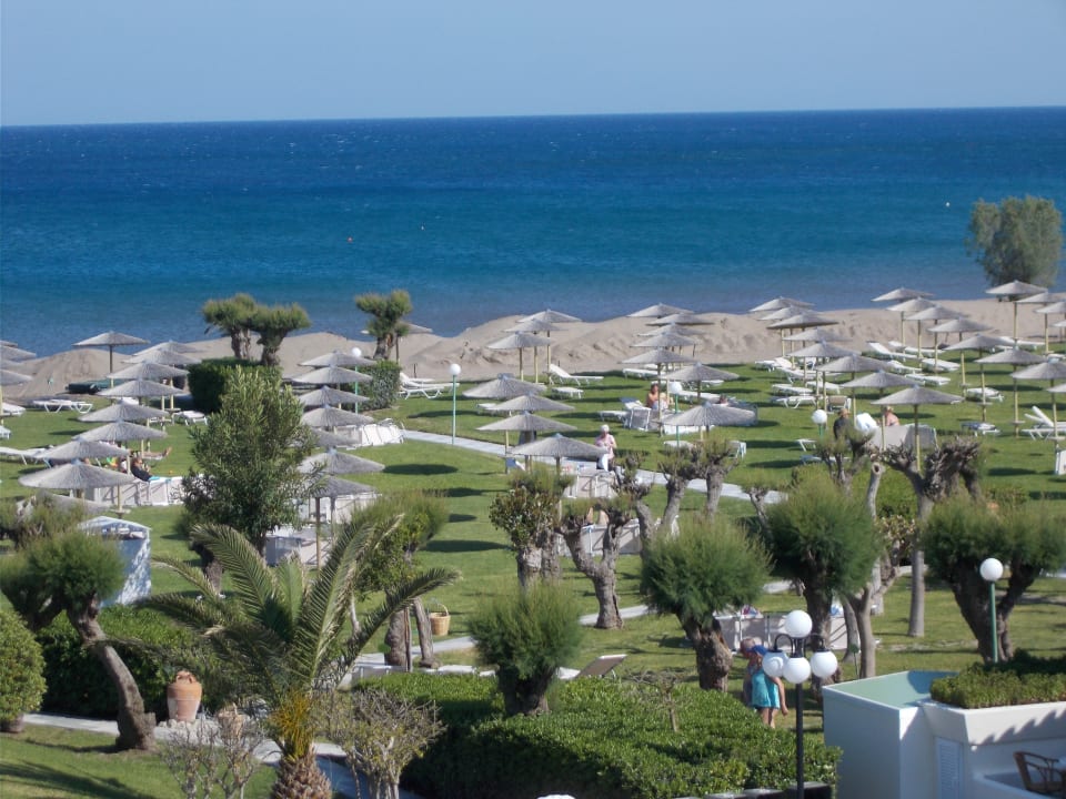 Schöne Rasenliegefläsche mit Hotelliegen und dahinter Sanddünen vom unplanierten Sandstrand.