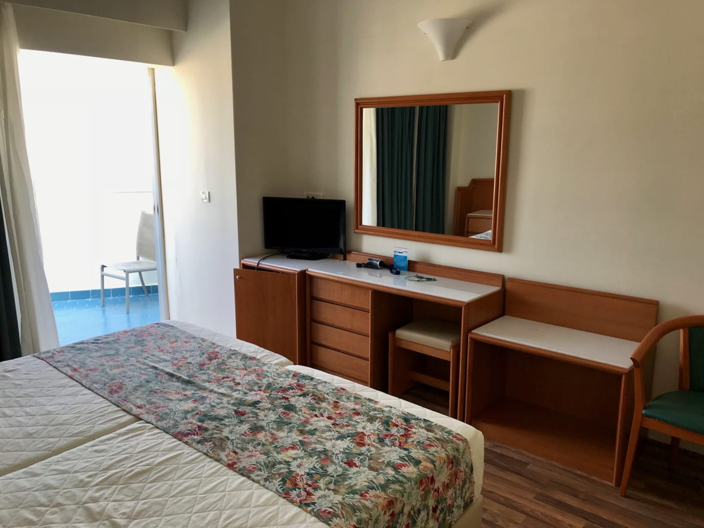 Schöner Schreibtischblock. Der Flachbild-TV scheint neu, der Bildschirm könnte allerdings größer sein. Etliche deutschsprachige Programme. Der Kühlschrank funktioniert, man kann mitgebrachte Flaschen reinstellen.