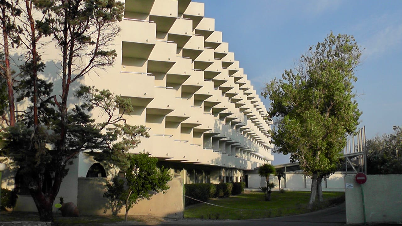 "Little Boxes", Zimmerbalkone auf der Seite der Indoor-Poolhalle