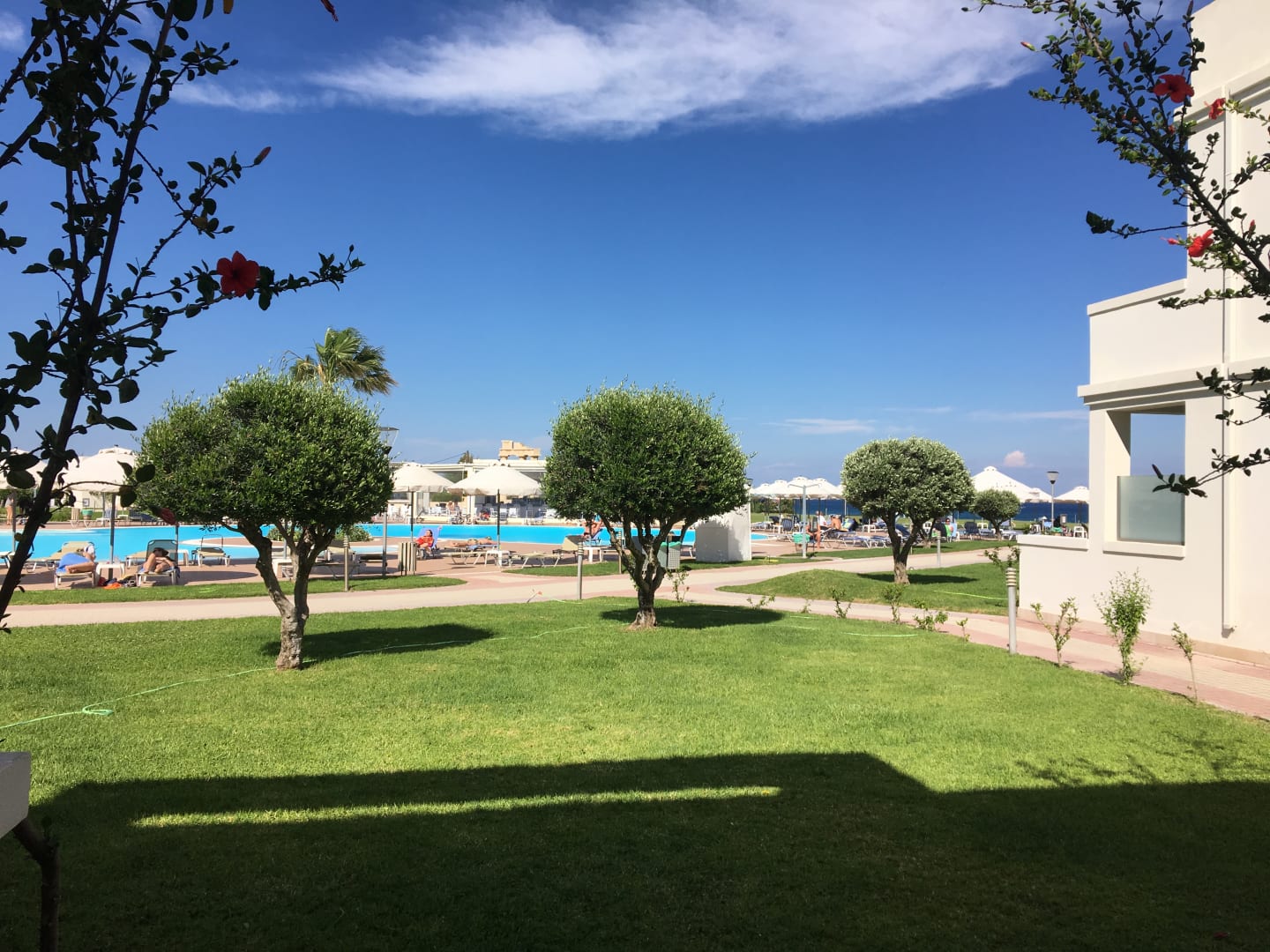 Blick vom Zimmer auf die Poolanlage