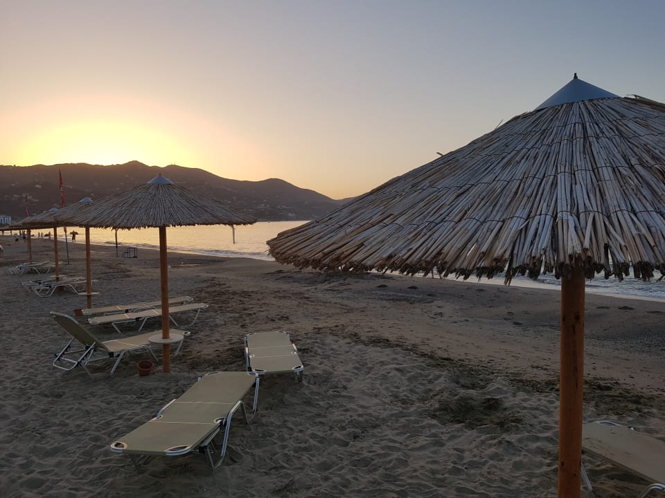 Blick auf den westlichen Teil des Strand (kurz vor Sonnenuntergang). An diesem Tag waren etwas höhere Wellen. Der Strand wird täglich (am Abend) von Mitarbeitern gereinigt und aufgeräumt.