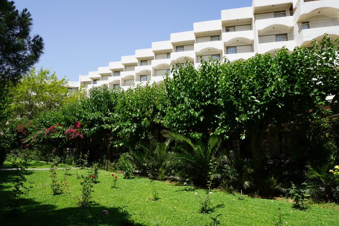 Hauptgebäude mit den Balkons in Blickrichtung Heraklion/seitlicher Meerblick/Garten
